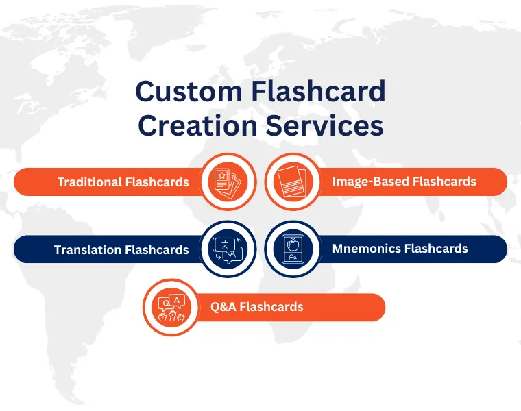 As one of the best flashcard creation service providers, we offer a wide range of custom flashcard types to cater to diverse learning needs and subjects. This includes traditional flashcards for straightforward memorization, image-based flashcards for visual learning, translation flashcards for language studies, mnemonics flashcards to aid in memory retention, question and answer flashcards for self-testing, and formula-based flashcards for subjects like mathematics and science. Each type is designed to enhance your learning experience using effective educational strategies making us a reliable choice among flashcard creation agencies.